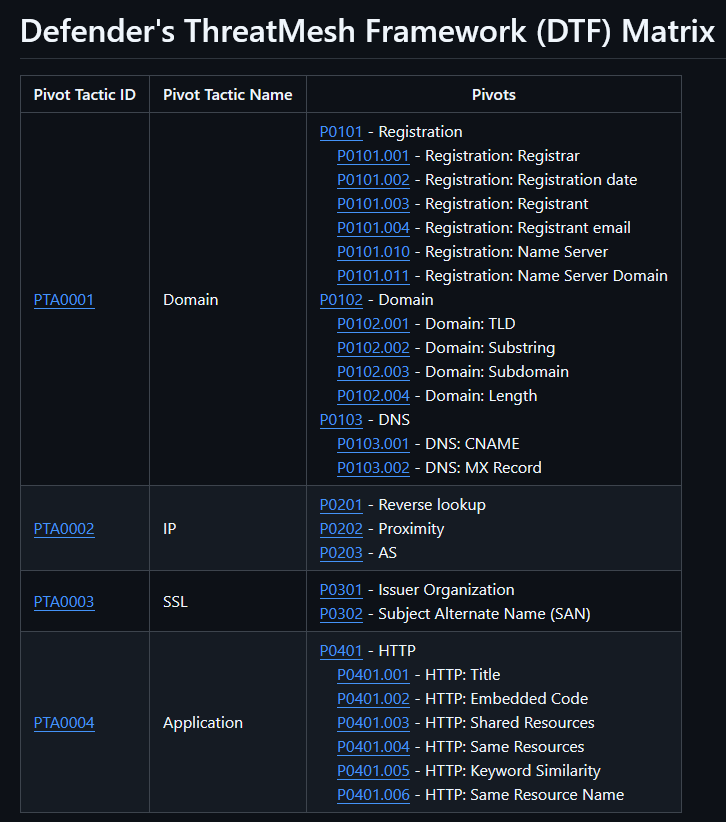 The DTF matrix is a simple table that shows the pivots grouped by the pivot tactic and ID. The tactics right now are Domain, IP, SSL, and Application. I made it in markdown format, and I put it on GitHub. This could be ideal for folks that use the Obsidian notes app (https://obsidian.md/). You could just download the repo, open it in Obsidian, and tag it up with your own notes. From the matrix, you can click into the tactics or the specific techniques, or just use it as a reference as you search for thrinfrastructure (threat-actor infrastructure) pivots. It is my hopes that DTF will help my fellow cyber thresearchers, thrunters (threat hunters), thranalysts (threat analysts), and thrintelligence (threat intelligence).